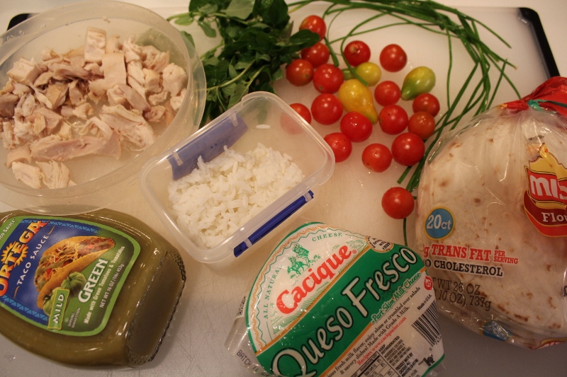 - In an 8×8 square pan, spread a layer of salsa verde. Top it with tortillas, sour cream, more salsa, chicken, rice, tomatoes, cheese, oregano, and chives. Sprinkle with cumin.