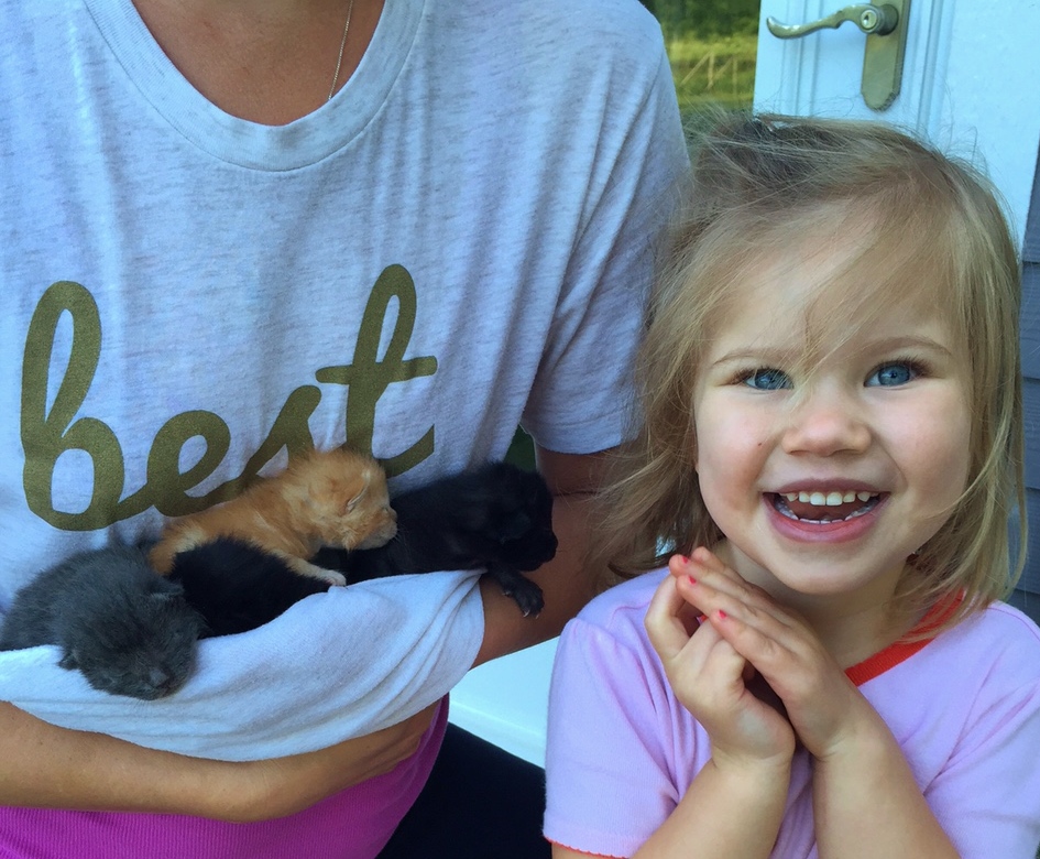 The kittens are barely a week old, downy and delicate, mewling quietly with their eyes closed. Ellis can’t resist them. I find her sneaking in the coop at all hours of the day – so much so that we’ve had to start locking it. She talks about the kittens constantly. She wants to show them to everyone who visits.