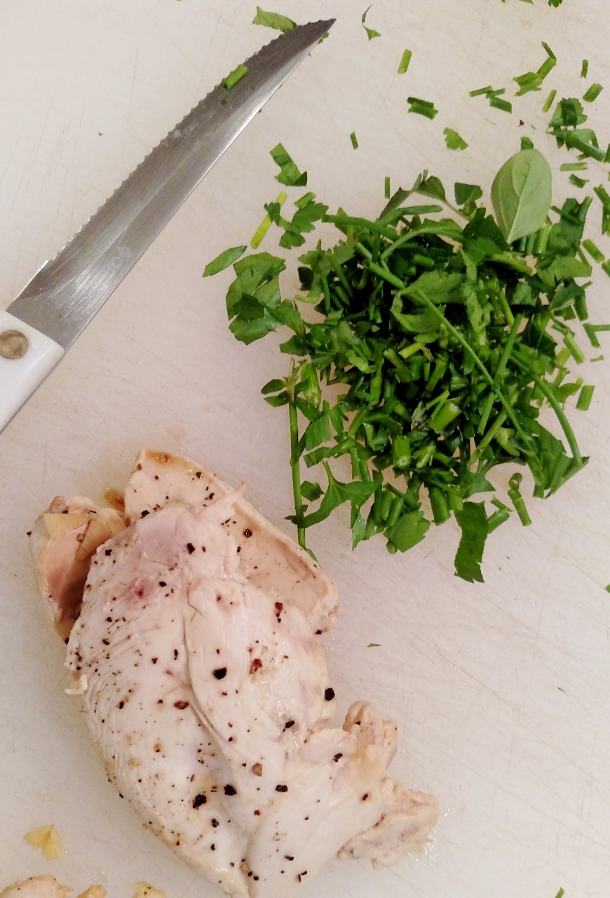1. Cook breasts whole, then chop, return to pan, and add veggies, herbs, and soup.