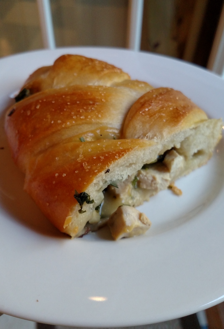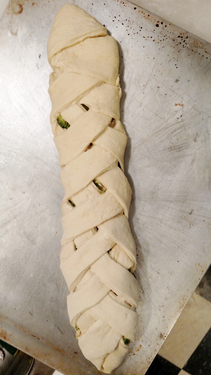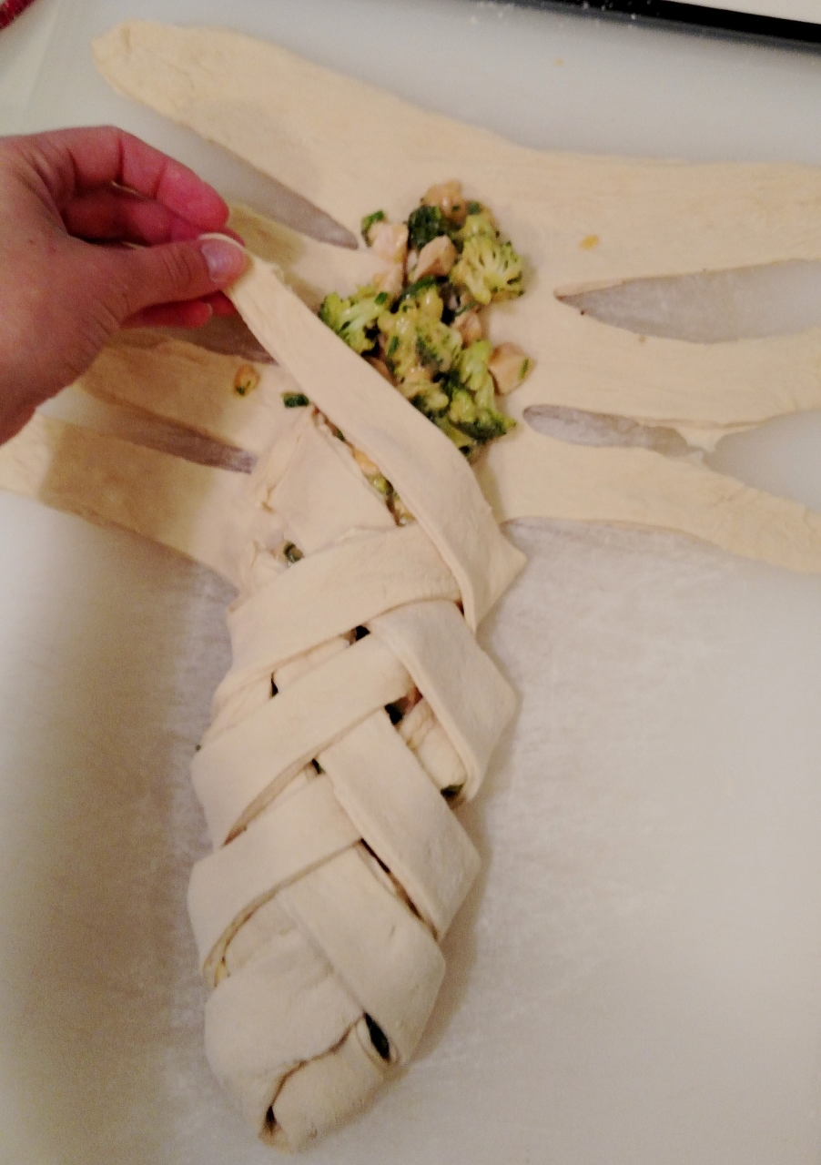 However, there wasn’t a lot of it. So I cut up some broccoli, chives, garlic, and parsley, and added that to the pan. I also added half a can of *wait for it* cream of chicken soup. We’re all about classy here. (Hey, after I posted a picture of my intended supper plans, a friend reminded me grouse can be dry.) I had bread dough in the fridge, so I rolled it out and cut the edges. Then I gently poured the meat mixture into the center of the dough, and overlapped the bread edges so that it looked like a braid.