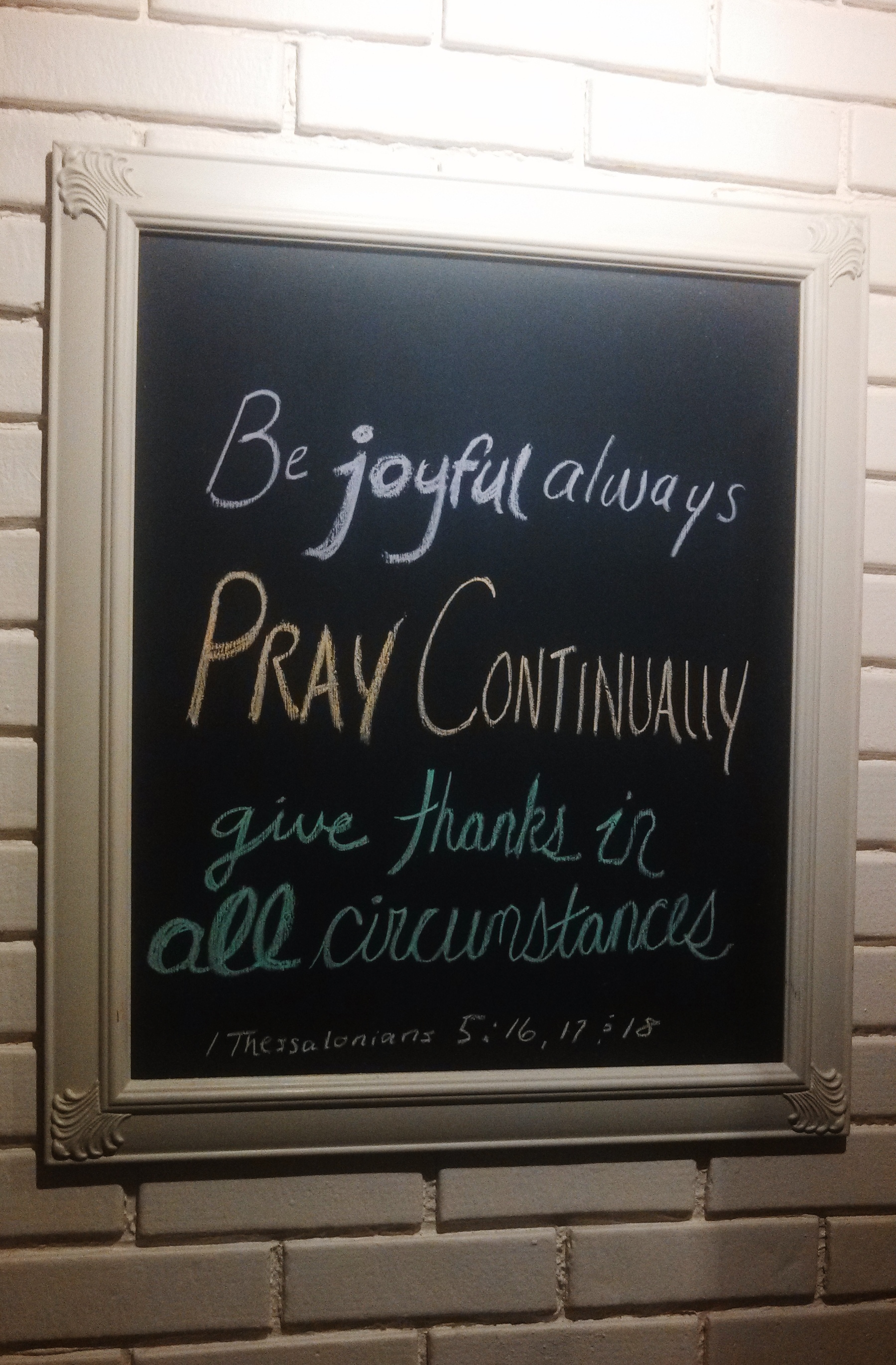 Earlier this summer, I wrote a verse from 1 Thessalonians on the board. In a way, I did it as a sort of challenge to myself. The verse read “Be joyful always. Pray continually. Give thanks in all circumstances.” It seemed like the formula for living present and aware. I figured the timing was about right, because I was already feeling all sorts of pregnant crazytown and it would be good to see a reminder about resetting my focus when things went haywire.